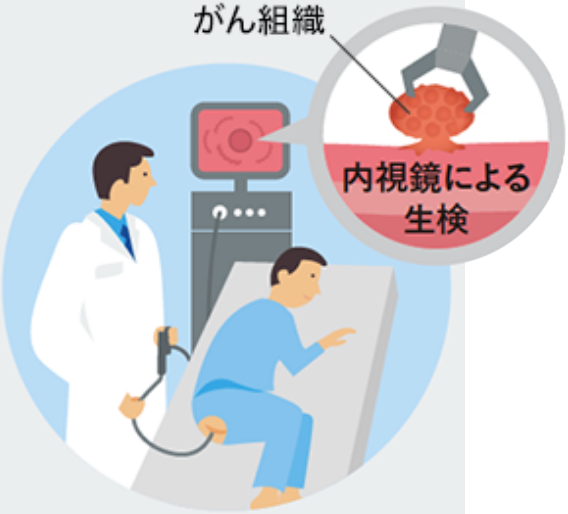 全血検体の場合、採取方法は採血です。一方、がん組織検体の場合、検体採取のために新たに生検*を行うか、過去に手術などでがん組織を採取していれば、それを使用できる場合もあります。